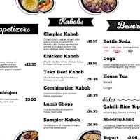 Our menu features a range of kabobs, including Chicken, Chaplee, Teka Beef, and the popular Sampler Kabob, each served with aromatic Qabili rice, homemade naan, and a refreshing cabbage salad. We also offer a selection of appetizers like Bolani and Borani Badenjon, as well as desserts such as Firni and Baklava to complete your dining experience.