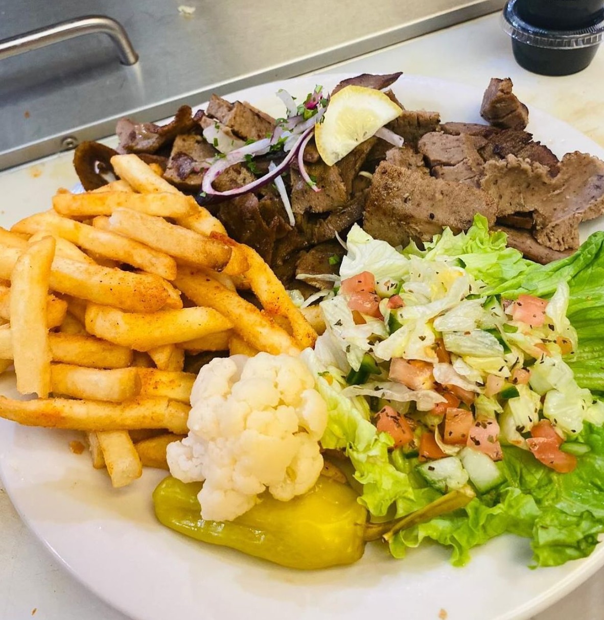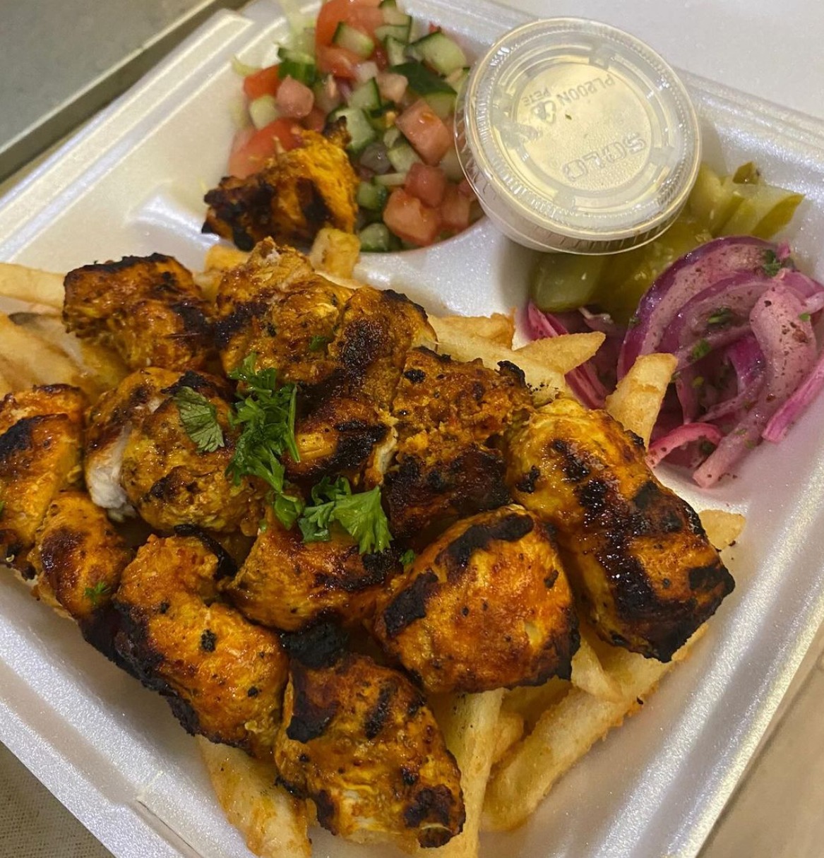 The menu features a variety of popular items, including grilled lamb and chicken kababs, beef shawarma, gyro wraps, falafel, hummus, baba ghanoush, and fresh salads. Each dish is carefully seasoned with traditional Mediterranean spices and grilled to perfection, offering customers a healthy and satisfying dining experience. The garlic sauce and house-made tahini are customer favorites, adding bold flavor to wraps and plates alike.