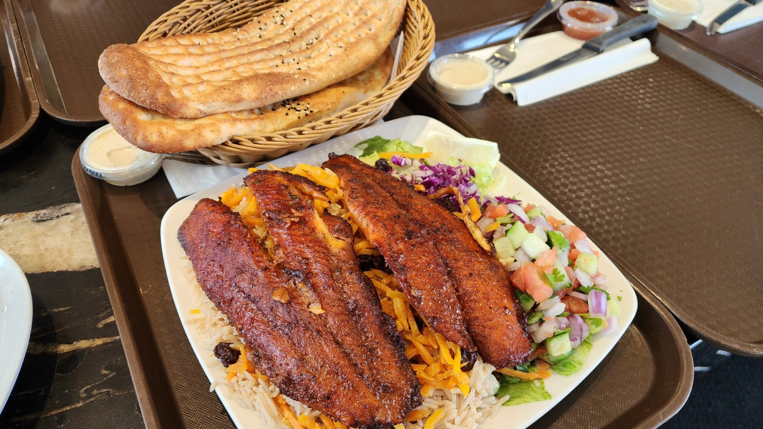 A selection of juicy healthy BBQ kabobs, rice, salad dishes with sides